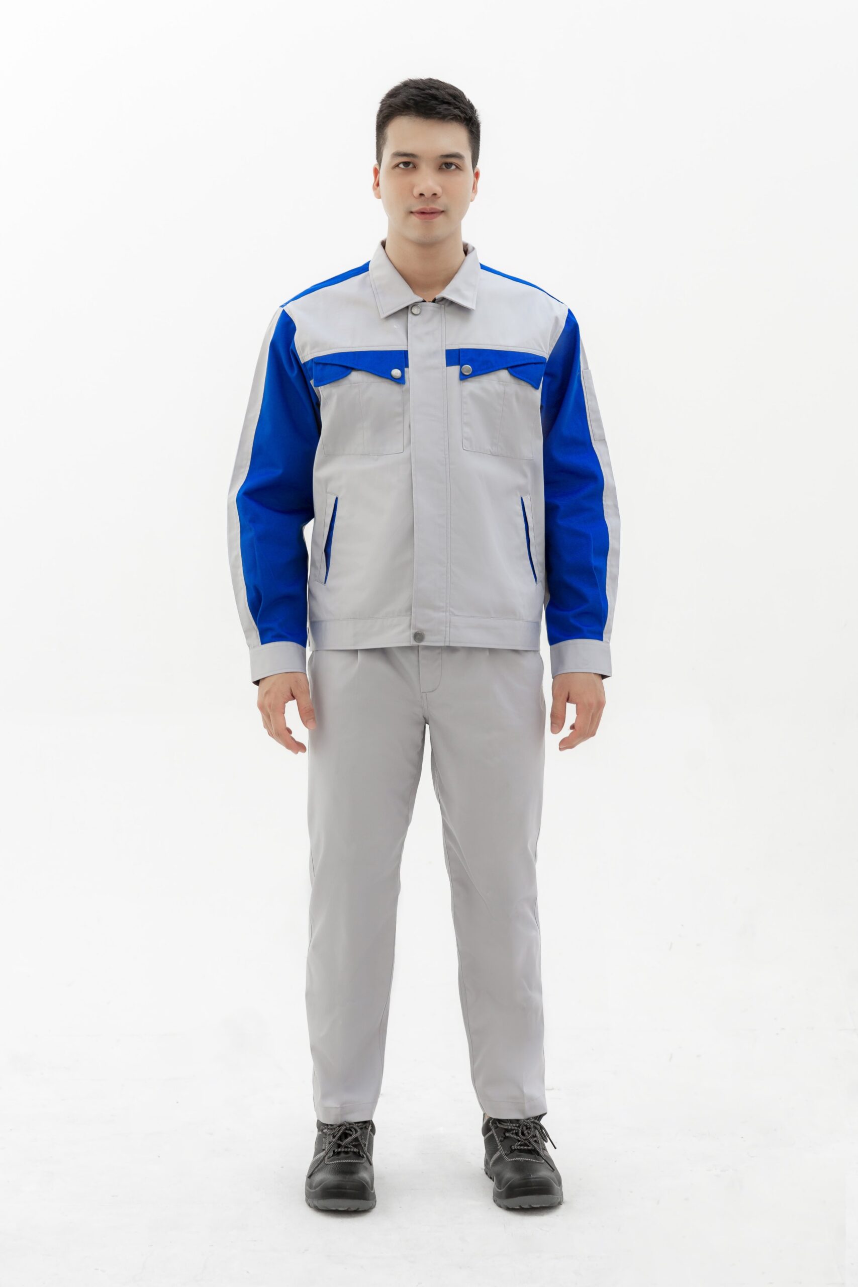 Bộ bảo hộ lao động màu ghi sáng phối xanh đậm siêu đẹp vải pangzim liên doanh